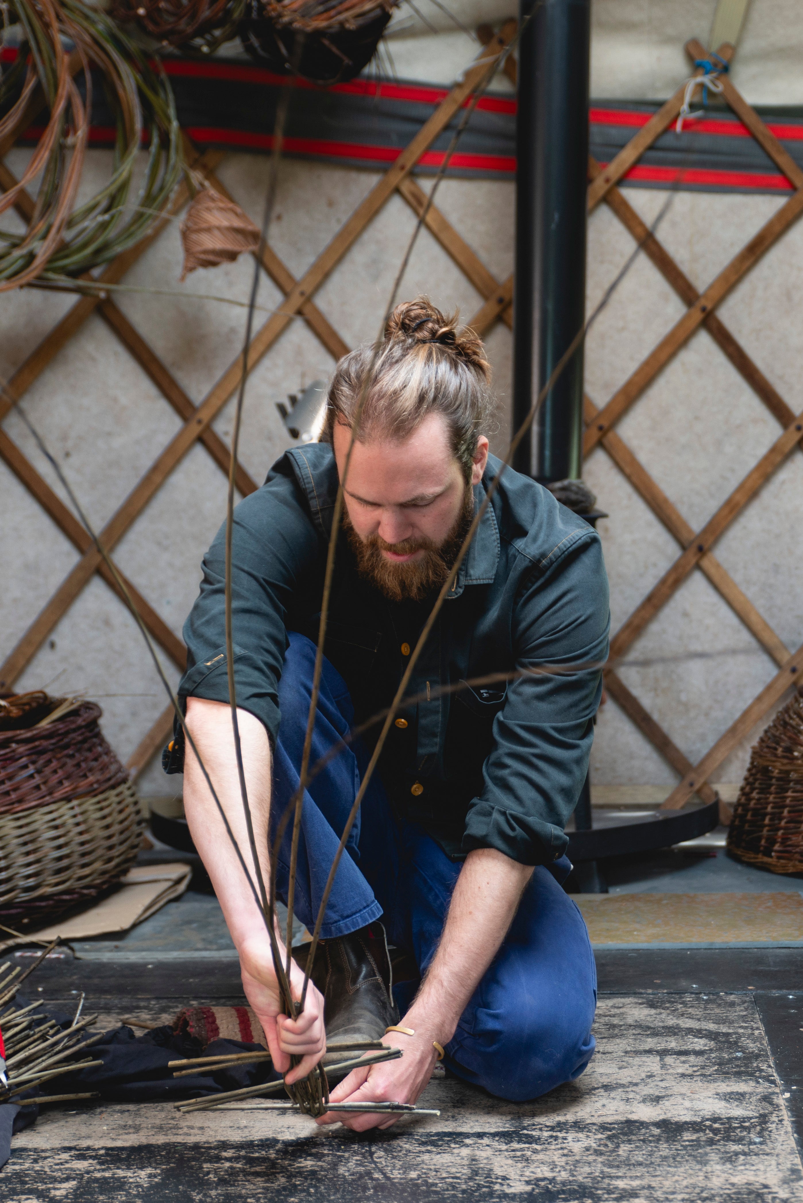 I started weaving wreaths from the yearly pruned offcuts of these structures, and was entranced by the hypnotic, meditative process of this. When the Covid-19 pandemic hit, I knew weaving would help me get through it. I took to foraging for sticks along the banks of the River Clyde in Glasgow, and taught myself to weave baskets from studying books.